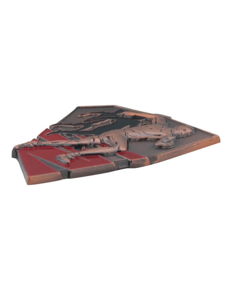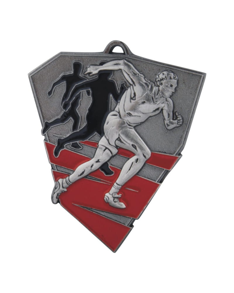 Imponująca, masywna i niezwykle dynamiczna pamiątka dedykowana pasjonatom biegów i lekkoatletyki. Wyróżnia się nieregularnym kształtem tarczy, bardzo dużym rozmiarem 75x63 mm oraz wyjątkową grubością (aż 4 mm), co nadaje jej potężny, wyczuwalnie ciężki charakter. Kunsztowny, trójwymiarowy awers przedstawia sprintera na bieżni. Projekt zyskał niesamowitą głębię dzięki zastosowaniu kolorowej emalii – czerwonej na torach bieżni oraz czarnej na sylwetkach biegaczy w tle. Szlachetne, matowe wykończenie w odcieniach postarzanego metalu dostępne jest w trzech wariantach: złoto patyna (1. miejsce), srebro patyna (2. miejsce) i brąz patyna (3. miejsce). Personalizacja tego modelu odbywa się poprzez wklejenie prostokątnej tabliczki sublimacyjnej na rewersie. To absolutnie bezkompromisowa nagroda na maratony, biegi przełajowe i prestiżowe zawody lekkoatletyczne.