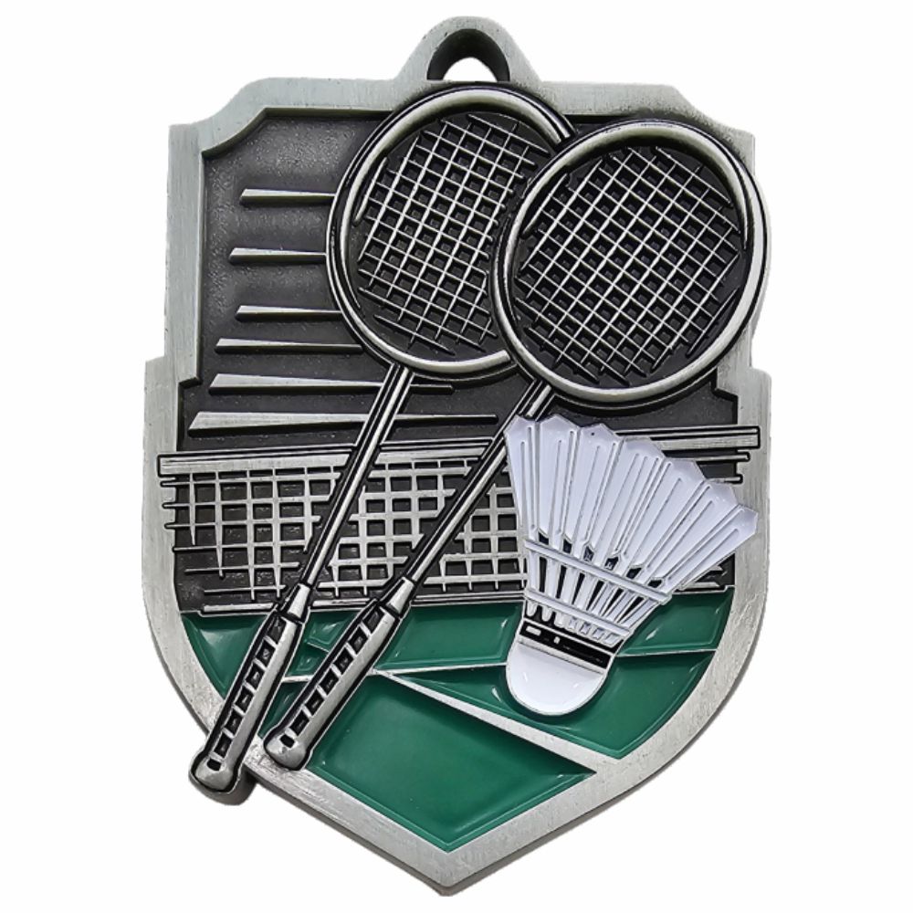 Ekstremalnie masywny i prestiżowy medal odlewany o tematyce badmintonowej. Wyróżnia się imponującą grubością aż 4 mm oraz wymiarami 76x54 mm. Kunsztowny, przestrzenny odlew 3D i 2D z motywem lotki i rakiet został efektownie wykończony barwną emalią. Medal dostępny jest w trzech szlachetnych wariantach: złoto patyna (1. miejsce), srebro patyna (2. miejsce) oraz brąz patyna (3. miejsce), co pozwala na skompletowanie pięknego i spójnego podium. Personalizacja odbywa się wyłącznie poprzez dedykowaną tabliczkę sublimacyjną montowaną na rewersie (w wyznaczonym miejscu o wymiarach 40x30 mm). To potężne, bezkompromisowe trofeum dla zwycięzców turniejów na najwyższym poziomie.