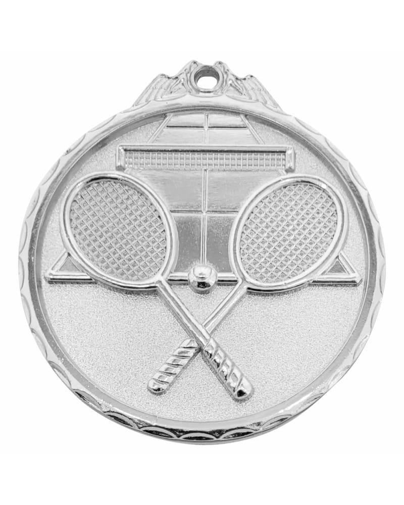 Imponujący, ekstremalnie masywny medal o tematyce tenisa ziemnego. Ten model wyróżnia się bezprecedensową grubością (aż 6 mm) oraz dużą średnicą 65 mm, co czyni go jednym z najpotężniejszych i najbardziej prestiżowych trofeów w ofercie. Kunsztowny, trójwymiarowy awers przedstawia dynamiczny motyw rakiety i piłki tenisowej. Medal dostępny jest w trzech lśniących wariantach kolorystycznych: złoto błysk (1. miejsce), srebro błysk (2. miejsce) i brąz błysk (3. miejsce), co pozwala na skompletowanie profesjonalnego zestawu nagród na całe podium. Personalizacja odbywa się wyłącznie za pomocą aluminiowych krążków sublimacyjnych. To absolutnie bezkompromisowe trofeum na prestiżowe turnieje na kortach otwartych i halowych.