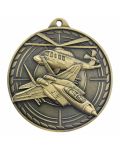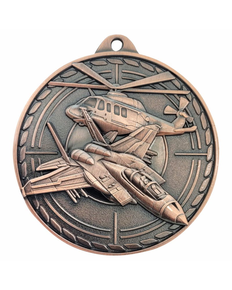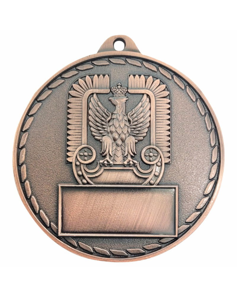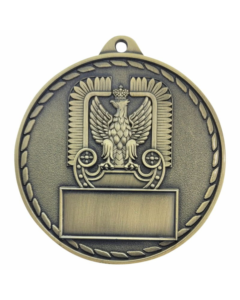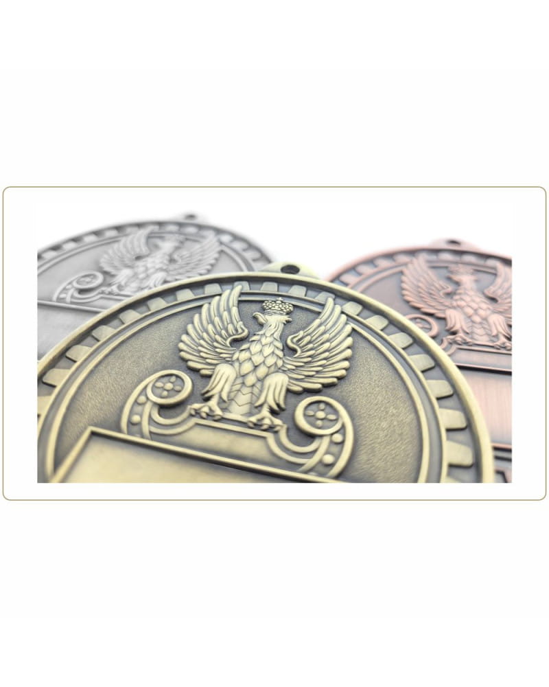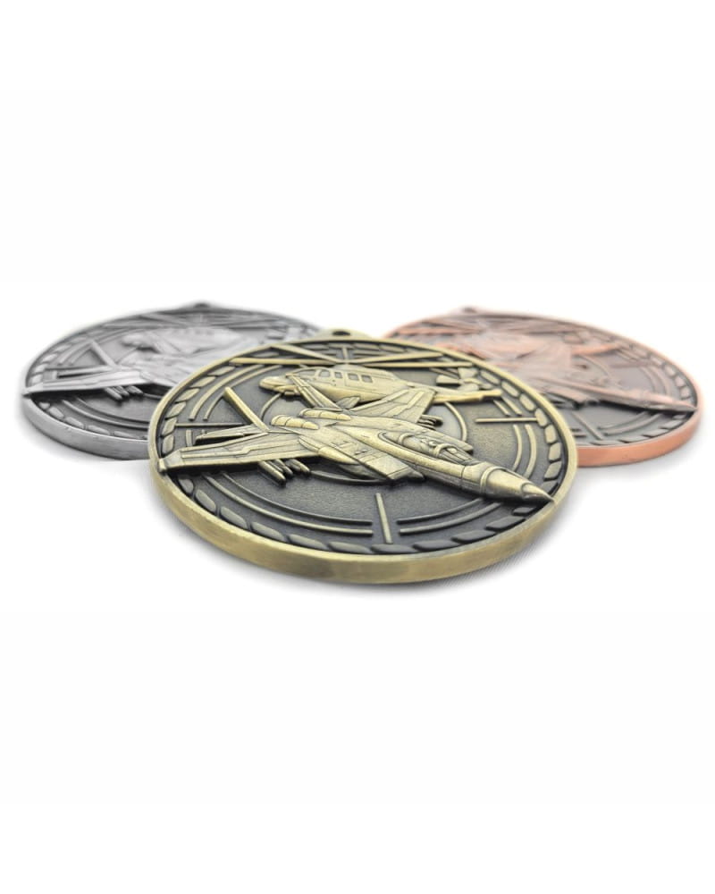 Imponujący, masywny i niezwykle prestiżowy medal o tematyce wojskowej i lotniczej. Wyróżnia się bardzo dużą średnicą 70 mm oraz wyjątkową grubością (aż 4 mm), co nadaje mu potężny, wyczuwalnie ciężki charakter – idealnie pasujący do służb mundurowych. Kunsztowny, trójwymiarowy awers przedstawia dynamiczną scenę z udziałem myśliwca i helikoptera na tle celownika radarowego. Całość wykończono w eleganckich, matowych odcieniach postarzanego metalu: złoto patyna (1. miejsce), srebro patyna (2. miejsce) i brąz patyna (3. miejsce). Personalizacja tego modelu odbywa się poprzez wklejenie niewielkiej, prostokątnej tabliczki sublimacyjnej na rewersie. To absolutnie bezkompromisowe trofeum na zawody lotnicze, zloty militarne, mistrzostwa służb mundurowych oraz zawody strzeleckie.