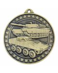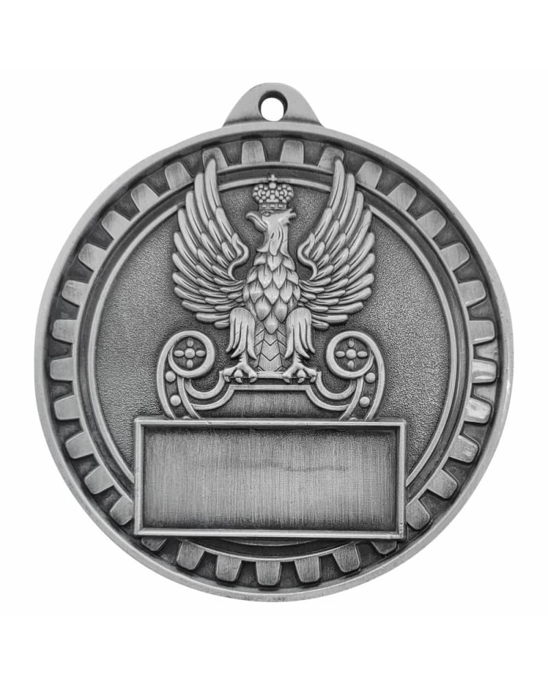 Imponujący, masywny i niezwykle prestiżowy medal o tematyce wojskowej i militarnej. Wyróżnia się bardzo dużą średnicą 70 mm oraz wyjątkową grubością (aż 4 mm), co nadaje mu potężny, wyczuwalnie ciężki charakter – idealnie pasujący do służb mundurowych. Kunsztowny, trójwymiarowy awers przedstawia wóz bojowy oraz czołg wpisane w surowe koło zębate. Całość wykończono w eleganckich, matowych odcieniach postarzanego metalu: złoto patyna (1. miejsce), srebro patyna (2. miejsce) i brąz patyna (3. miejsce). Personalizacja tego modelu odbywa się poprzez wklejenie niewielkiej, prostokątnej tabliczki sublimacyjnej na rewersie. To absolutnie bezkompromisowe trofeum na zawody strzeleckie, zloty militarne, rozgrywki ASG, paintball oraz uroczystości jednostek wojskowych.