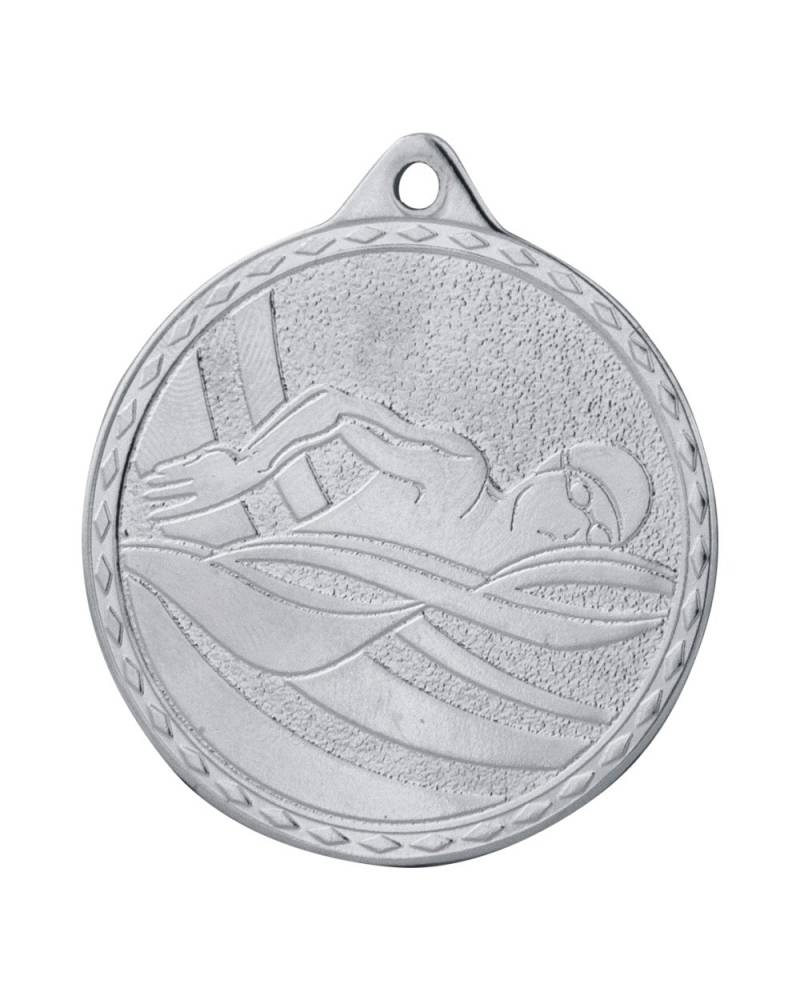 Klasyczny i ekonomiczny medal o tematyce pływackiej. Posiada uniwersalną średnicę 50 mm oraz standardową grubość 2 mm, co czyni go lekkim, a zarazem bardzo estetycznym trofeum, które doskonale sprawdza się na masowych zawodach na basenie i otwartych akwenach. Trójwymiarowy awers przedstawia dynamiczny motyw zawodnika w trakcie płynięcia. Medal dostępny jest w trzech lśniących wariantach kolorystycznych: złoto błysk (1. miejsce), srebro błysk (2. miejsce) i brąz błysk (3. miejsce), ułatwiając skompletowanie pełnego, profesjonalnego podium. Personalizacja tego modelu odbywa się wyłącznie za pomocą aluminiowych krążków sublimacyjnych. To świetny wybór o doskonałym stosunku jakości do ceny na międzyszkolne zawody pływackie, mistrzostwa klubowe i szkółki pływackie.