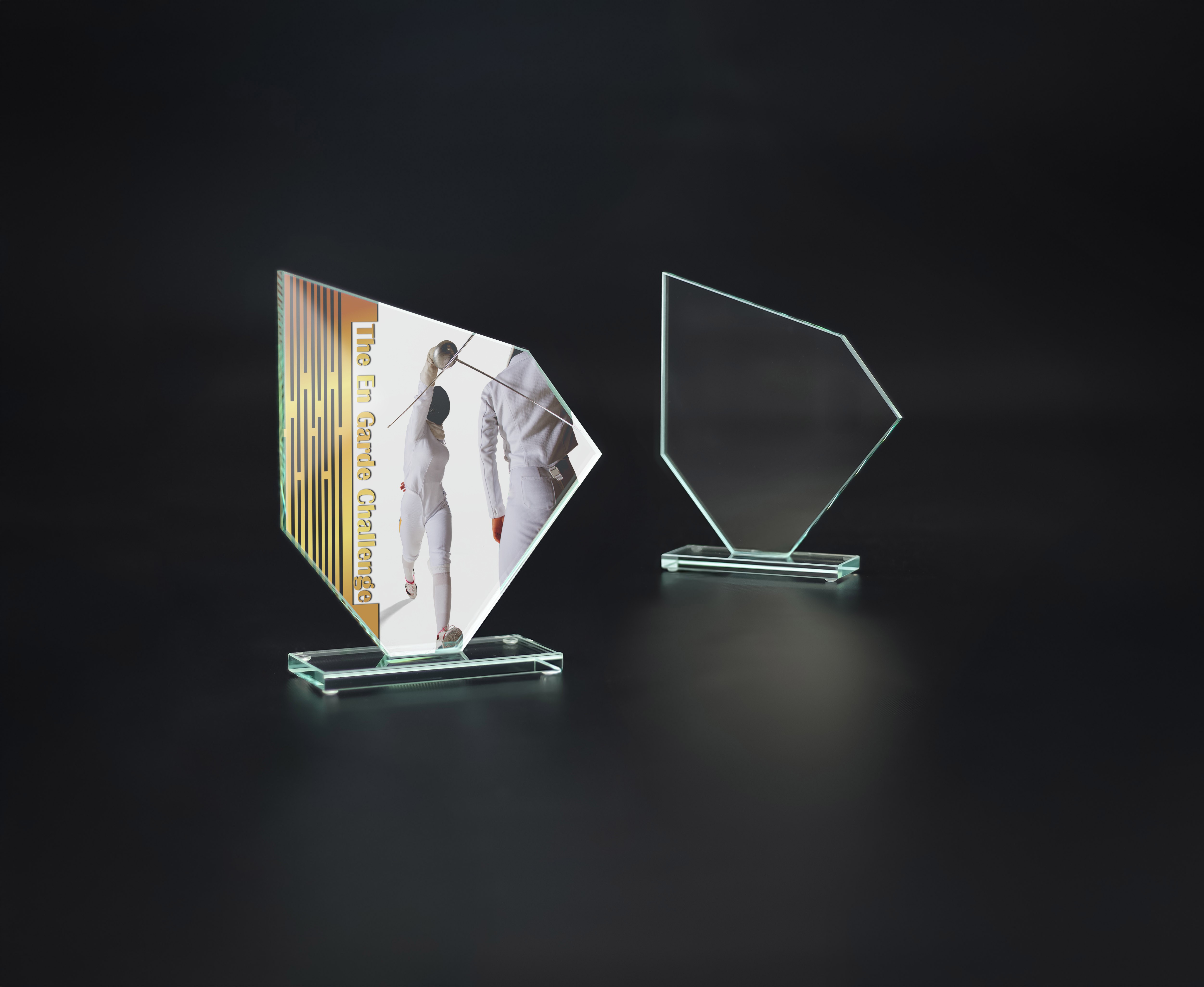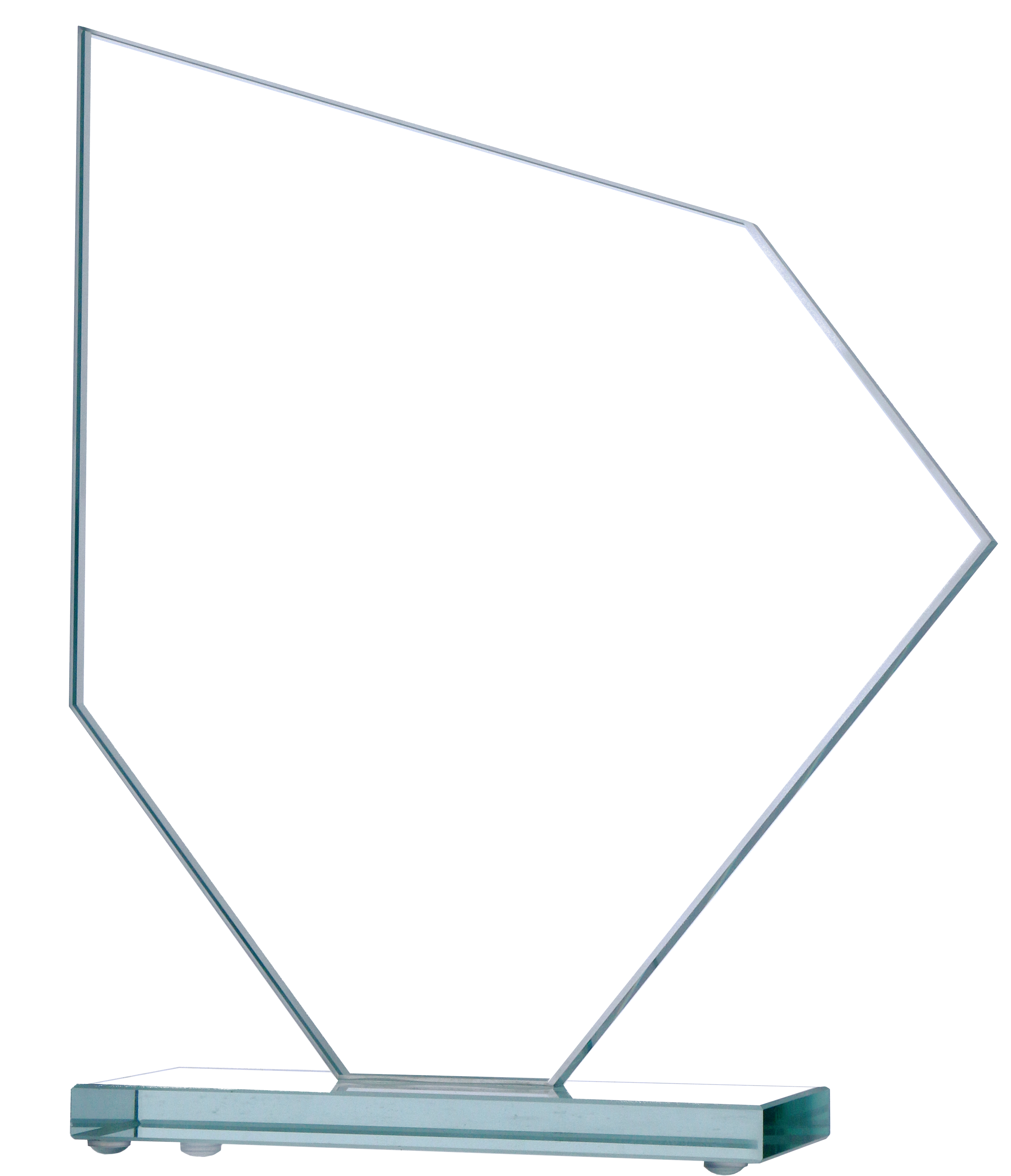 Kształt: Asymetryczny żagiel / dynamiczna flaga (nieregularny pięciokąt) na szklanej podstawie