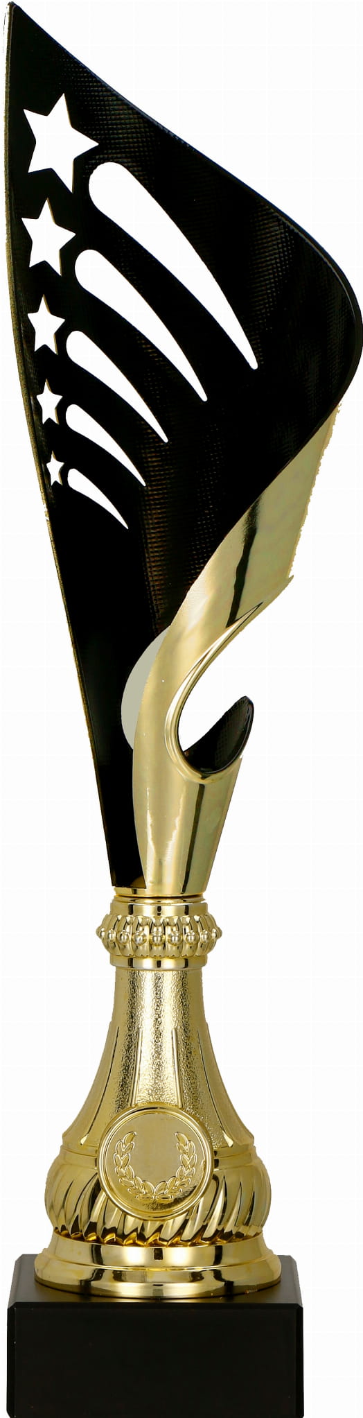 Nowoczesne wzornictwo i kolorystyka pucharu, połączenie koloru złotego z czarnym w kielichu z wyciętymi gwiazdami oraz połączenie kielicha z elegancką czarną, marmurową podstawą tworzą z tego trofeum znakomita nagrodę przeznaczoną np. dla szkółek i akademii sportowych.