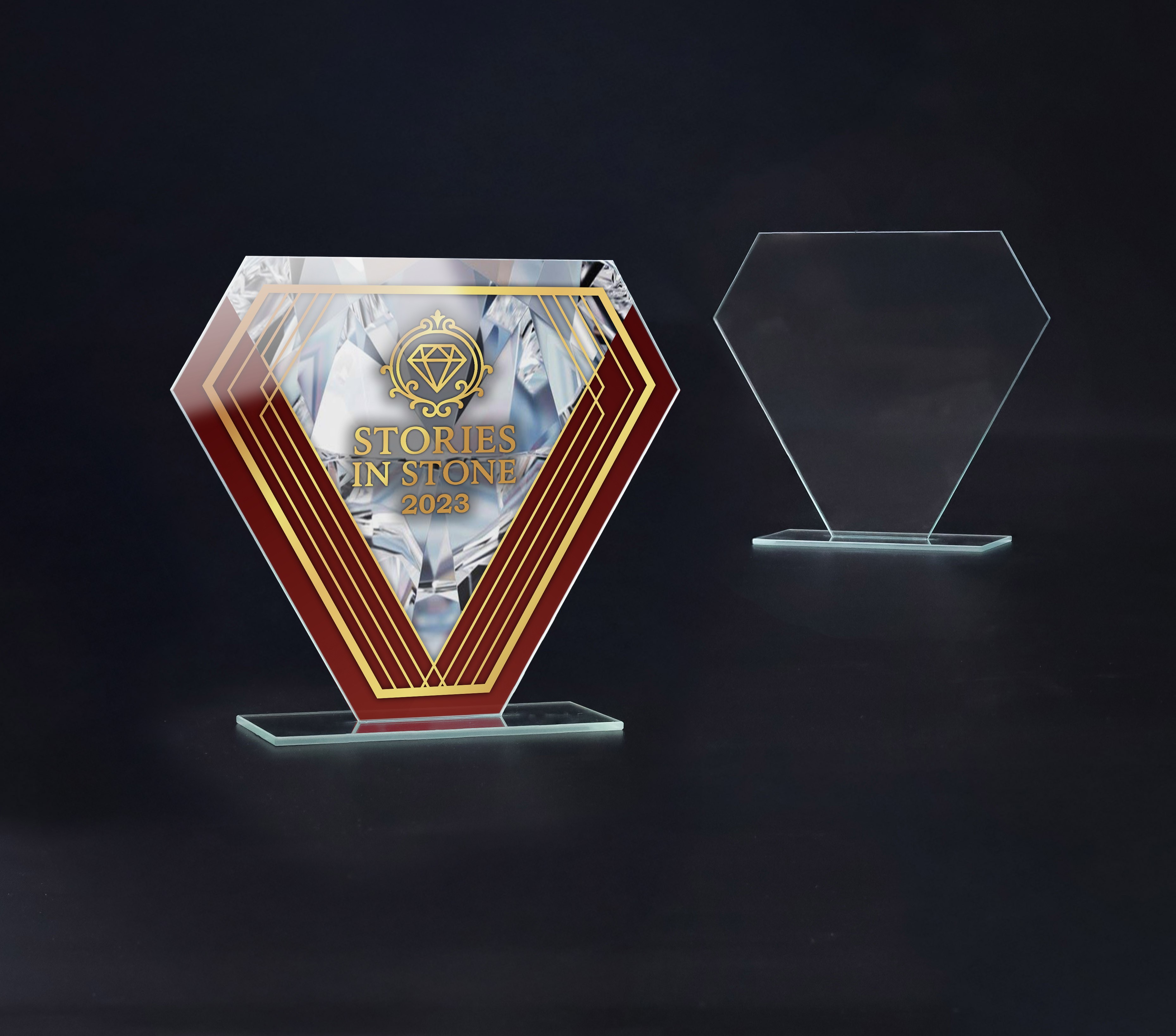 Technika Łączona (Premium): Zbuduj efekt przestrzenny! Aplikując barwny nadruk UV na tylnej ściance bryły, a wyrazisty tekst w formie graweru z farbą na jej froncie, uzyskasz niesamowicie oryginalną, warstwową nagrodę.