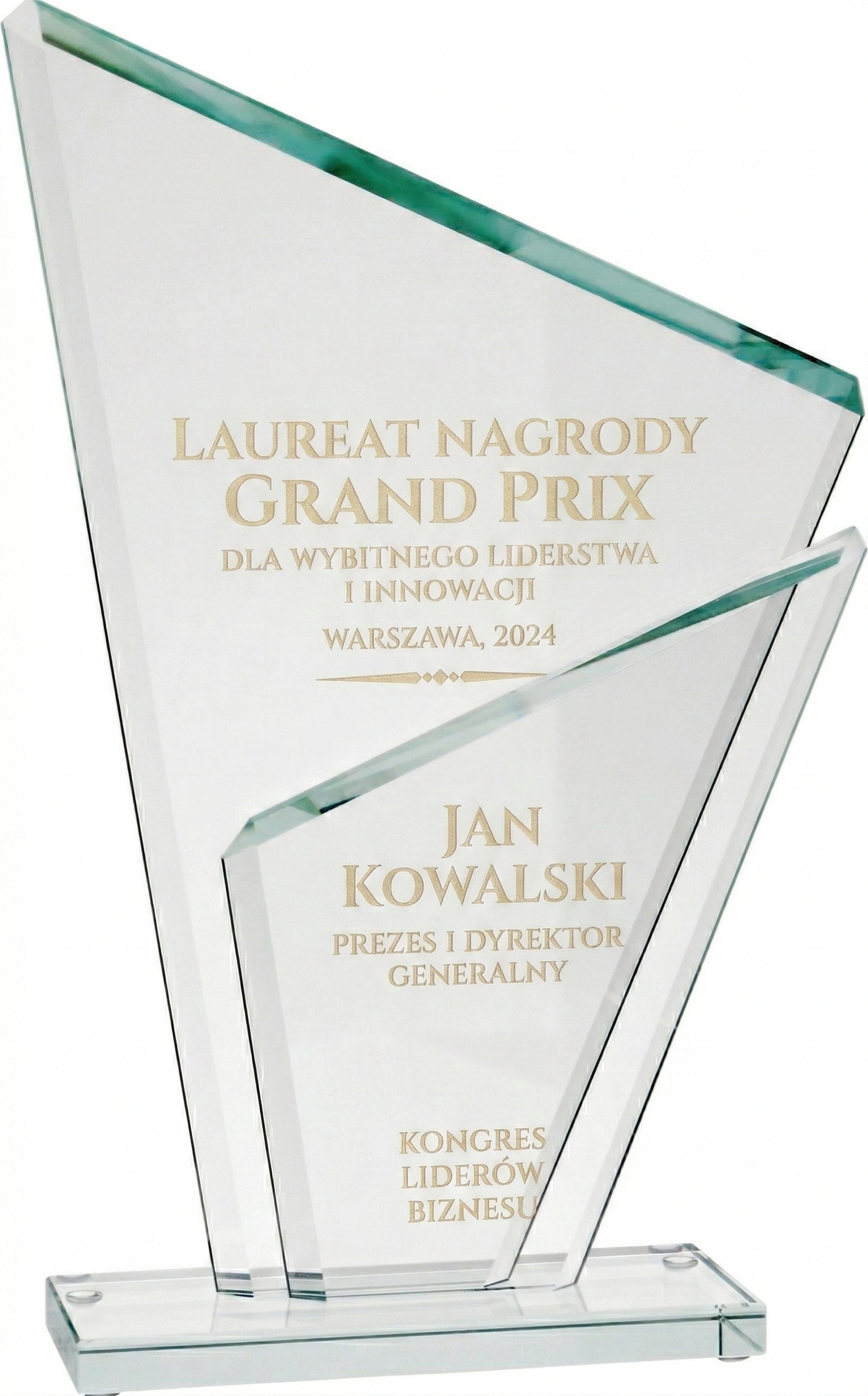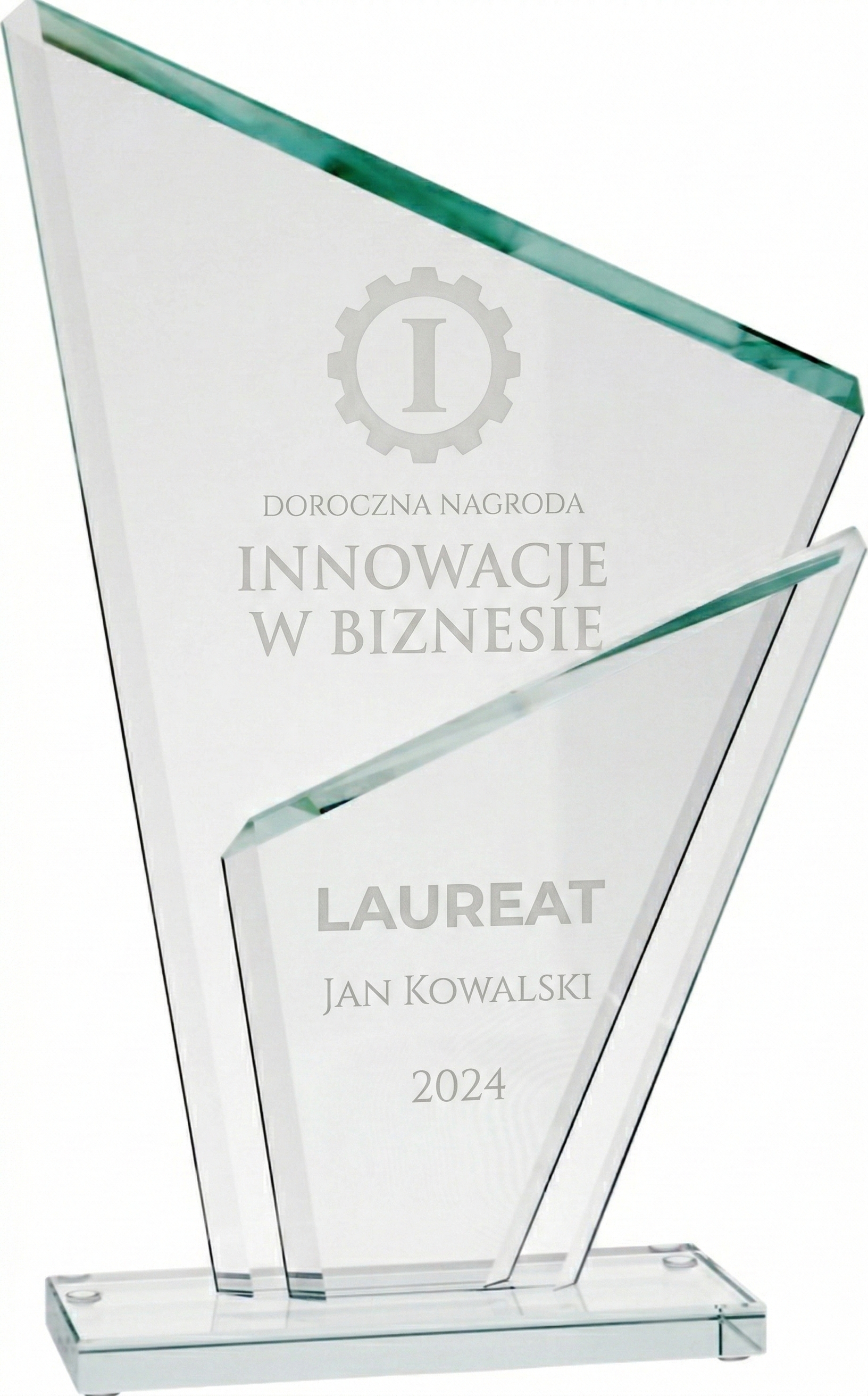 Szukasz innowacyjnego wyróżnienia, które swoim niesztampowym, wielowymiarowym designem natychmiast przyciągnie spojrzenia? Wybierz zjawiskowe trofeum szklane | GS802. Ta imponująca, dynamiczna bryła wyróżnia się warstwową konstrukcją – składa się z dwóch asymetrycznych tafli szkła (każda o grubości 0,8 cm) osadzonych na wspólnej podstawie. Statuetka mierzy aż 29,5 cm wysokości, 18,5 cm szerokości i waży solidne 1,4 kg. Jej naturalnie zielony odcień szkła nadaje całości klasycznego sznytu. Podwójna budowa to absolutny przełom w personalizacji – pozwala na aplikację nadruku lub graweru na obu taflach niezależnie, tworząc spektakularny, fizyczny efekt przestrzennej głębi. Do nagrody możesz dobrać dedykowane, eleganckie etui (model H283/BK).