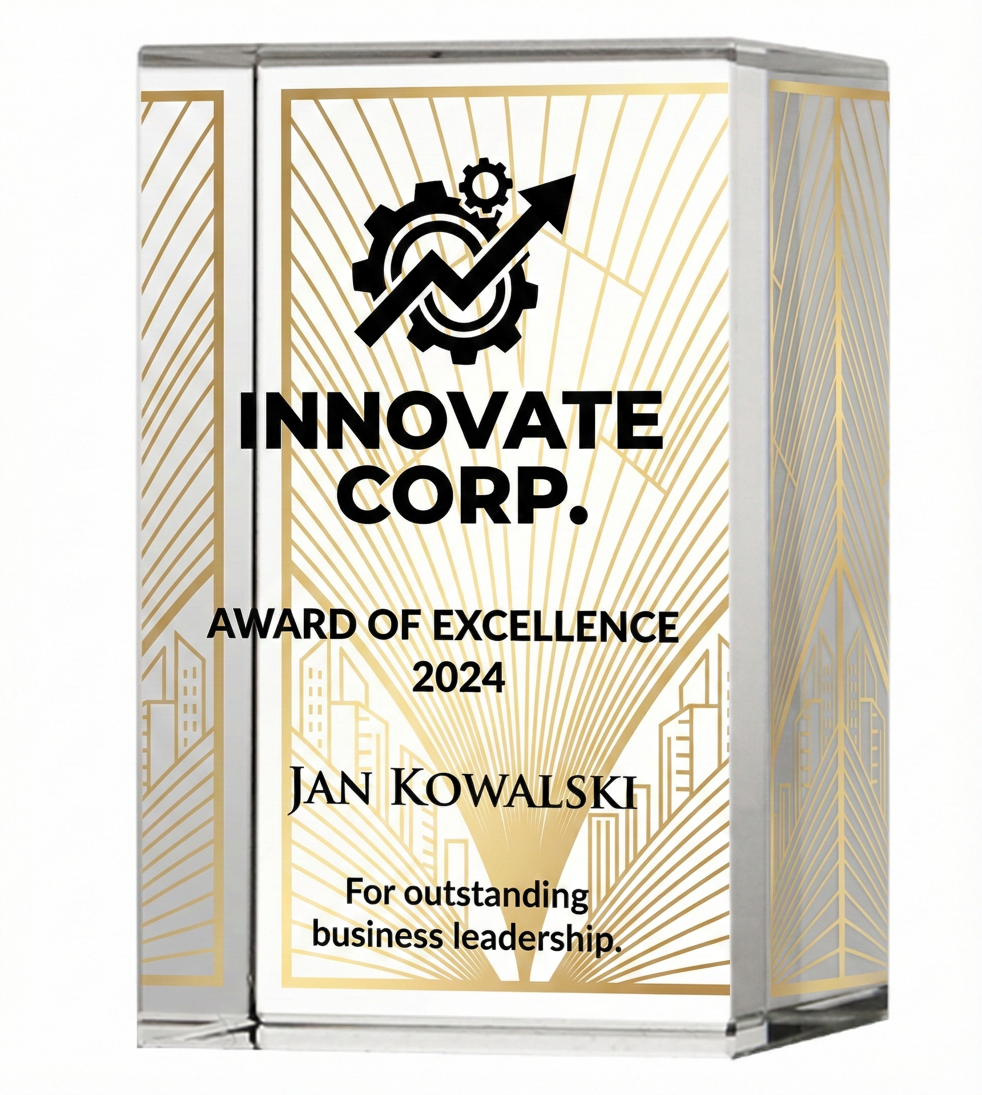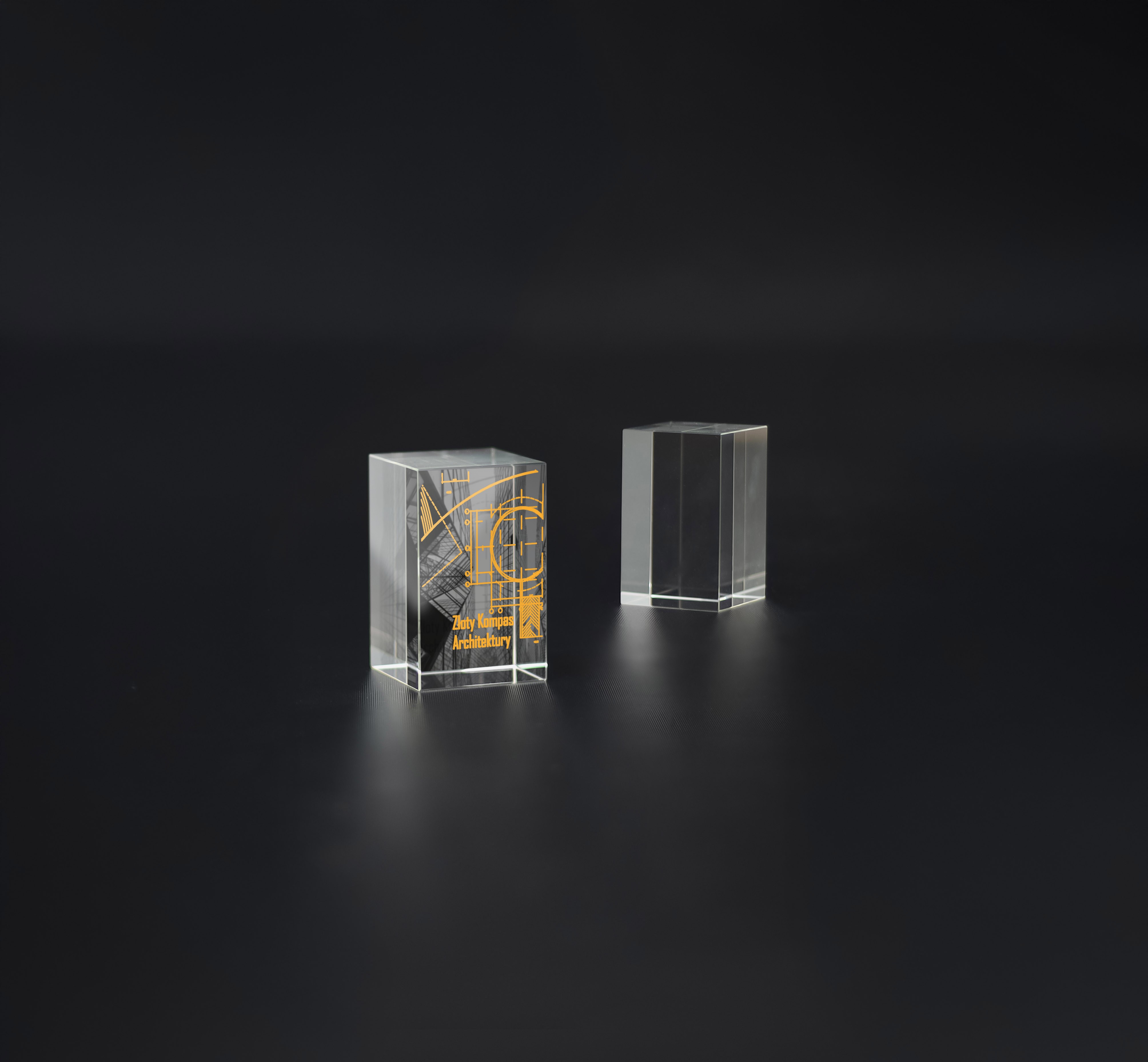 Technika Łączona (Premium: Nadruk + Grawer z farbą): Najbardziej zjawiskowa opcja produkcyjna. Aplikując kolorowy nadruk na tylnej ścianie szklanego prostopadłościanu, a precyzyjny grawer z farbą na jego froncie, kreujemy niesamowity, przestrzenny efekt głębi (3D). Tak zaprojektowane trofeum przyciąga wzrok i całkowicie deklasuje tradycyjne nagrody!