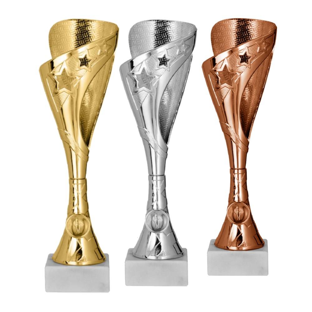 Seria pucharów 9329 to doskonały kompromis pomiędzy bardzo atrakcyjną ceną a eleganckim, tradycyjnym wyglądem. Smukły kielich wykonany z wysokiej jakości metalizowanego plastiku pięknie odbija światło, a masywna, marmurowa podstawa sprawia, że puchar pewnie leży w dłoniach zwycięzcy podczas uroczystej dekoracji.