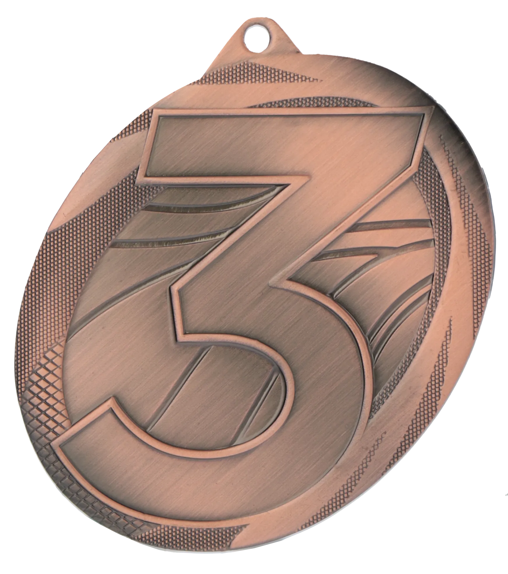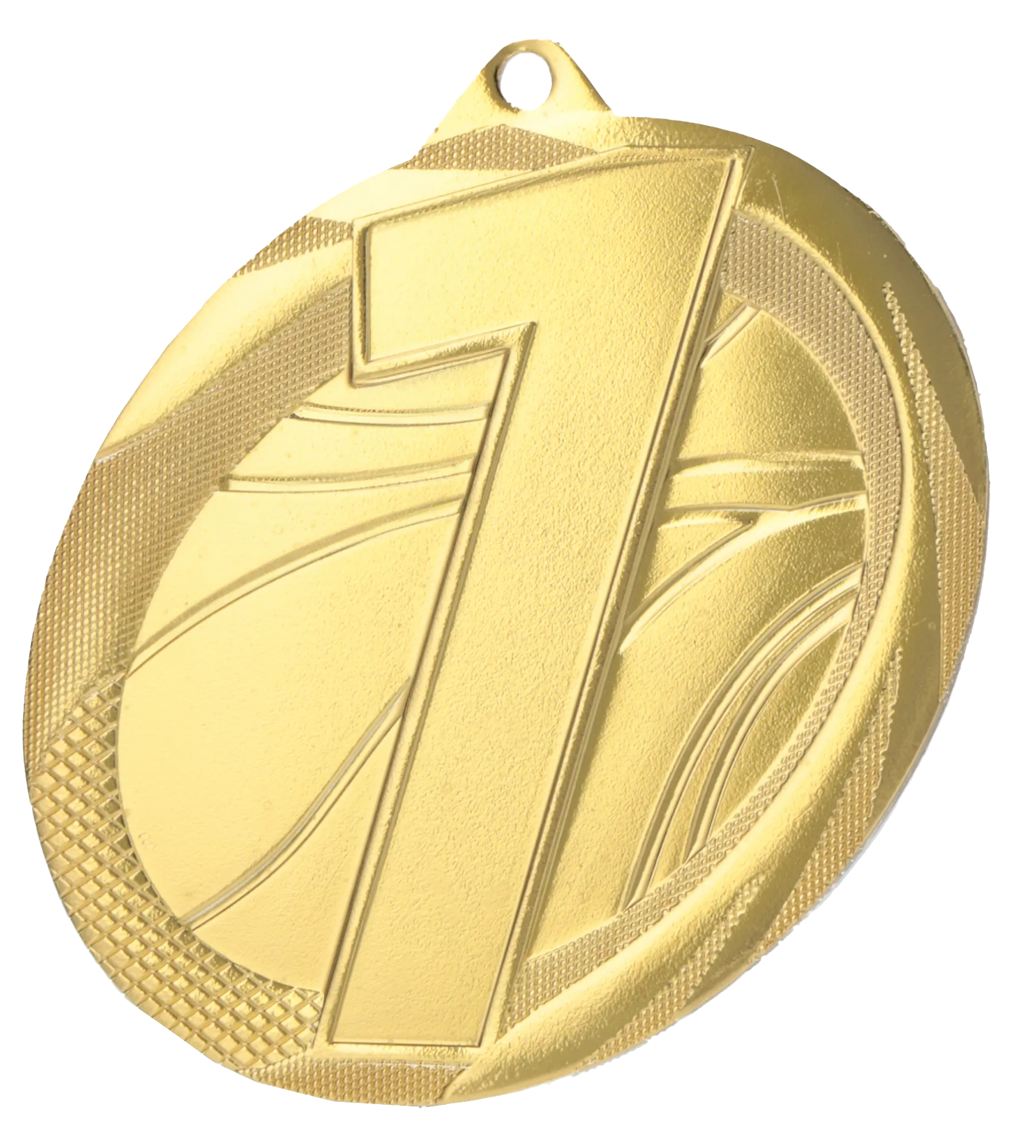 Solidny, ciężki medal stalowy o średnicy 50 mm, charakteryzujący się niezwykle uniwersalnym i nowoczesnym designem. Posiada głęboko tłoczony awers z wyraźną, dużą cyfrą wskazującą zajęte miejsce na podium, umieszczoną na tle dynamicznych, falistych linii. Medal dostępny jest w trzech wariantach odpowiednich do miejsca: złoty (cyfra 1), srebrny (cyfra 2) oraz brązowy (cyfra 3). To absolutny klasyk, który doskonale sprawdzi się jako nagroda we wszelkich zawodach sportowych, konkursach szkolnych, olimpiadach wiedzy, turniejach e-sportowych czy podczas firmowych imprez integracyjnych.