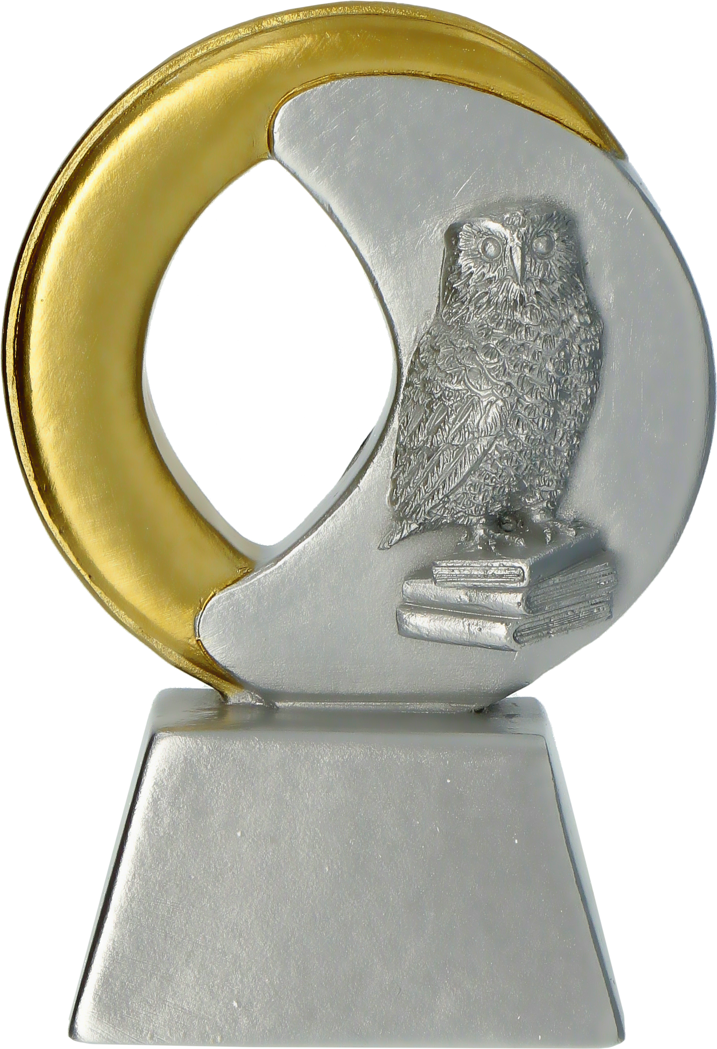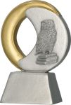 Klasyczna, pełna symboliki i elegancka pamiątka dedykowana szeroko pojętemu szkolnictwu i edukacji. Statuetka RE034 o wysokości 10 cm została precyzyjnie wykonana z trwałej masy żywiczno-podobnej. Przestrzenną kompozycję tworzy sowa – uniwersalny symbol mądrości – dumnie siedząca na stosie książek, wpisana w zgrabną, okrągłą ramę. Całość utrzymana jest w gustownej, srebrnej tonacji, którą efektownie przełamuje złoty detal na krawędzi. Masywna podstawa figurki posiada wyprofilowane miejsce na pamiątkową tabliczkę o wymiarach 47 x 26 mm. To doskonały, symboliczny upominek na Dzień Nauczyciela, zakończenie roku szkolnego, pożegnanie absolwentów oraz nagroda w konkursach naukowych.