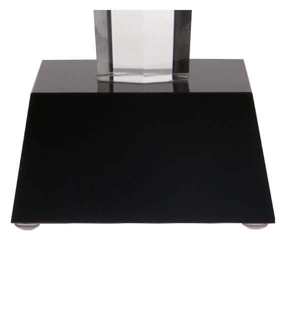 Górna część statuetki (przezroczysta tafla): W tej strefie proponujemy zastosowanie klasycznego graweru laserowego, który na przejrzystym szkle daje bardzo subtelny, elegancki efekt szronienia (mleczny kolor). To doskonały wybór dla minimalistycznych logotypów i dłuższych tekstów. Jeśli preferujesz mocniejszy akcent wizualny, wygrawerowane elementy możemy także wypełnić wybranym kolorem farby.