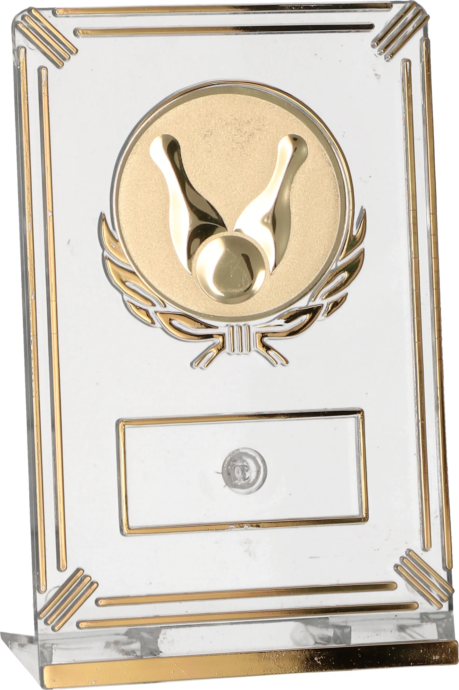 Eleganckie i okolicznościowe trofeum plastikowe w kolorze złotym, dedykowane pasjonatom kręgli oraz bowlingu. Ta prosta w formie, ale dająca wiele możliwości personalizacji nagroda tworzy wyjątkowe trofeum oraz niezapomnianą pamiątkę dla obdarowanego. Posiada imponujący emblemat o średnicy 50 mm z motywem kręglarskim (dynamiczna sylwetka zawodnika i kręgle). Idealne na turnieje ligowe, zawody amatorskie, imprezy firmowe oraz jako wyróżnienie za „Strike” roku. Puchar posiada wyznaczone miejsce na tabliczkę z grawerem lub nadrukiem (ok. 50x20 mm), którą można dokupić oddzielnie.