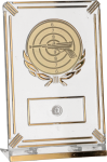 Głównym punktem statuetki jest duży, wypukły emblemat o średnicy 50 mm. Przedstawia on kunsztownie wykonaną sylwetkę pistoletu sportowego na tle klasycznej tarczy strzeleckiej z punktacją. Nadaje to nagrodzie prestiżowy, autentycznie strzelecki i bardzo czytelny charakter. Przezroczysta oprawa z lśniącymi, złotymi akcentami sprawia, że trofeum pięknie i z dumą prezentuje się w gablocie każdego strzelca.