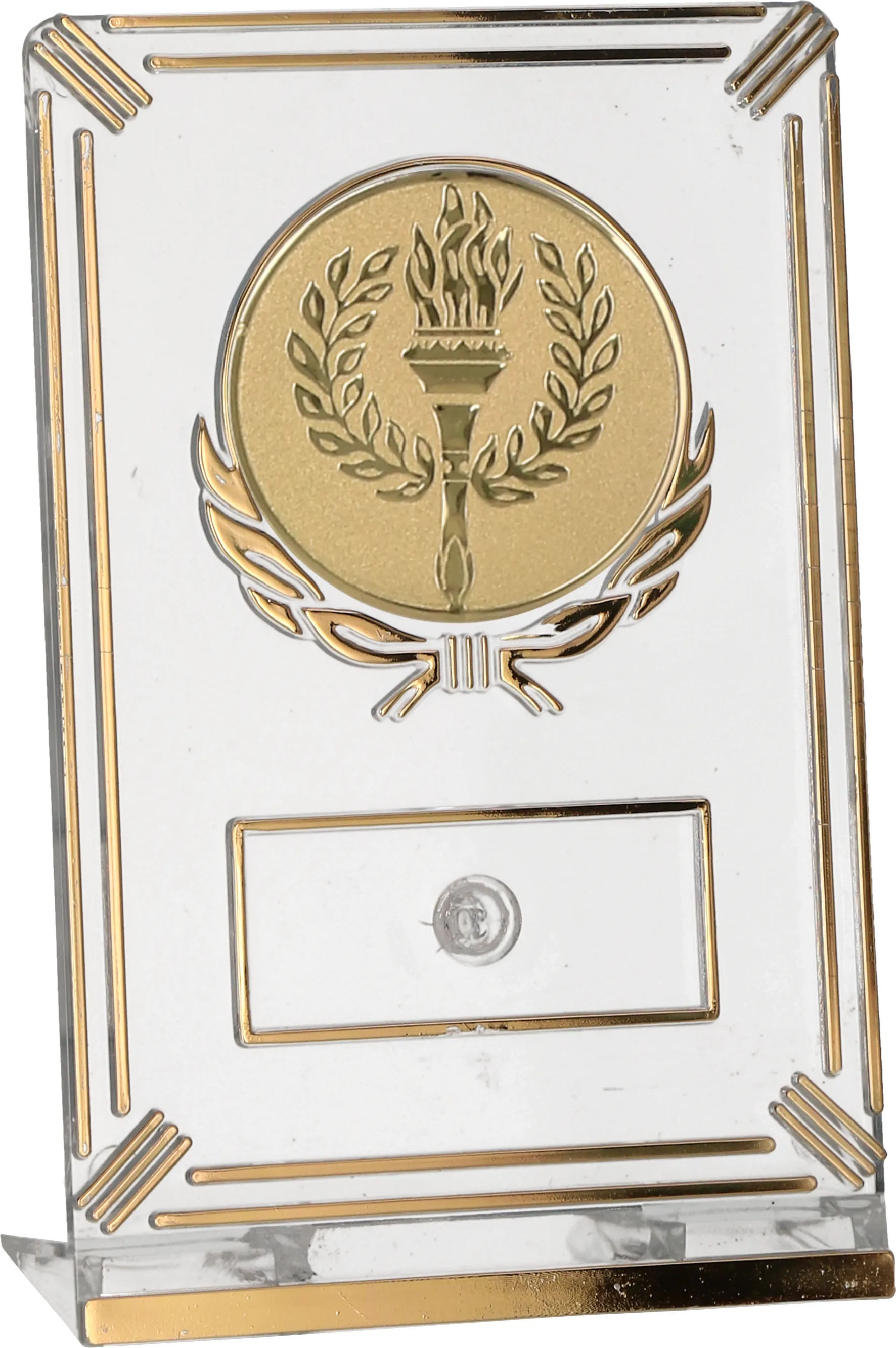Eleganckie i okolicznościowe trofeum plastikowe ze złotymi detalami, dedykowane na absolutnie każdą okazję. Ta prosta w formie, klasyczna nagroda tworzy wyjątkowe wyróżnienie oraz niezapomnianą pamiątkę. Posiada imponujący emblemat o średnicy 50 mm z uniwersalnym motywem płonącego znicza i wieńca laurowego. Idealne jako nagroda we wszelkich zawodach sportowych, olimpiadach szkolnych i przedmiotowych, turniejach amatorskich oraz jako symboliczne wyróżnienie za pokonywanie własnych granic. Trofeum posiada wyznaczone miejsce na tabliczkę z grawerem lub nadrukiem (ok. 50x20 mm), którą można dokupić oddzielnie.